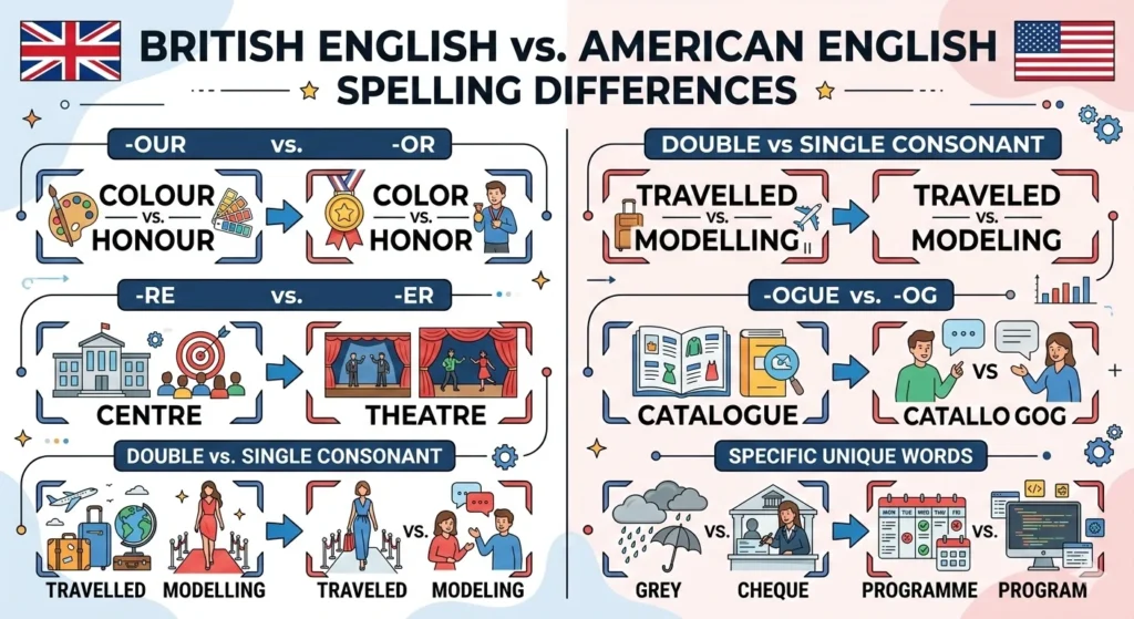 The confusion happens because British and American English follow different spelling rules. In this complete guide, you will learn the meaning, grammar rule, origin, real examples, common mistakes, worksheet, quiz, and expert writing advice.